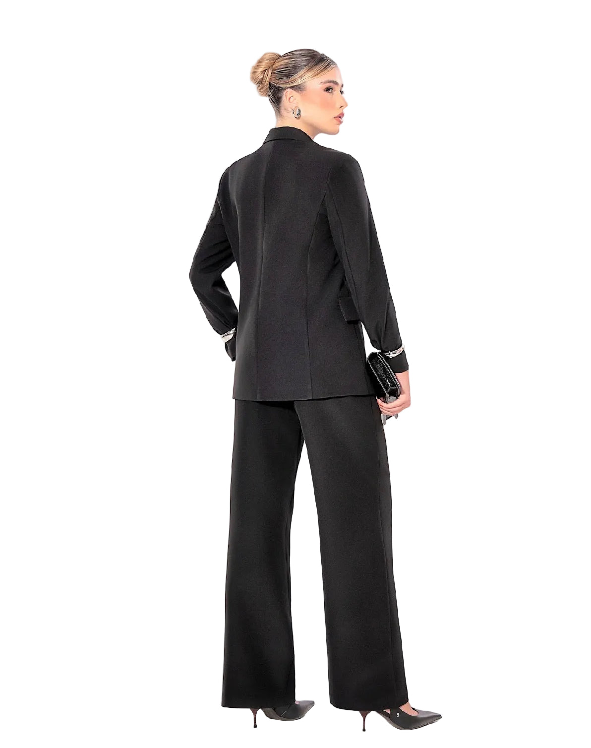 The high-waisted wide-leg pants offer elegance, comfort, and a refined drape that elongates the figure. Impeccably crafted, this set transitions effortlessly from business settings to elevated evening occasions.