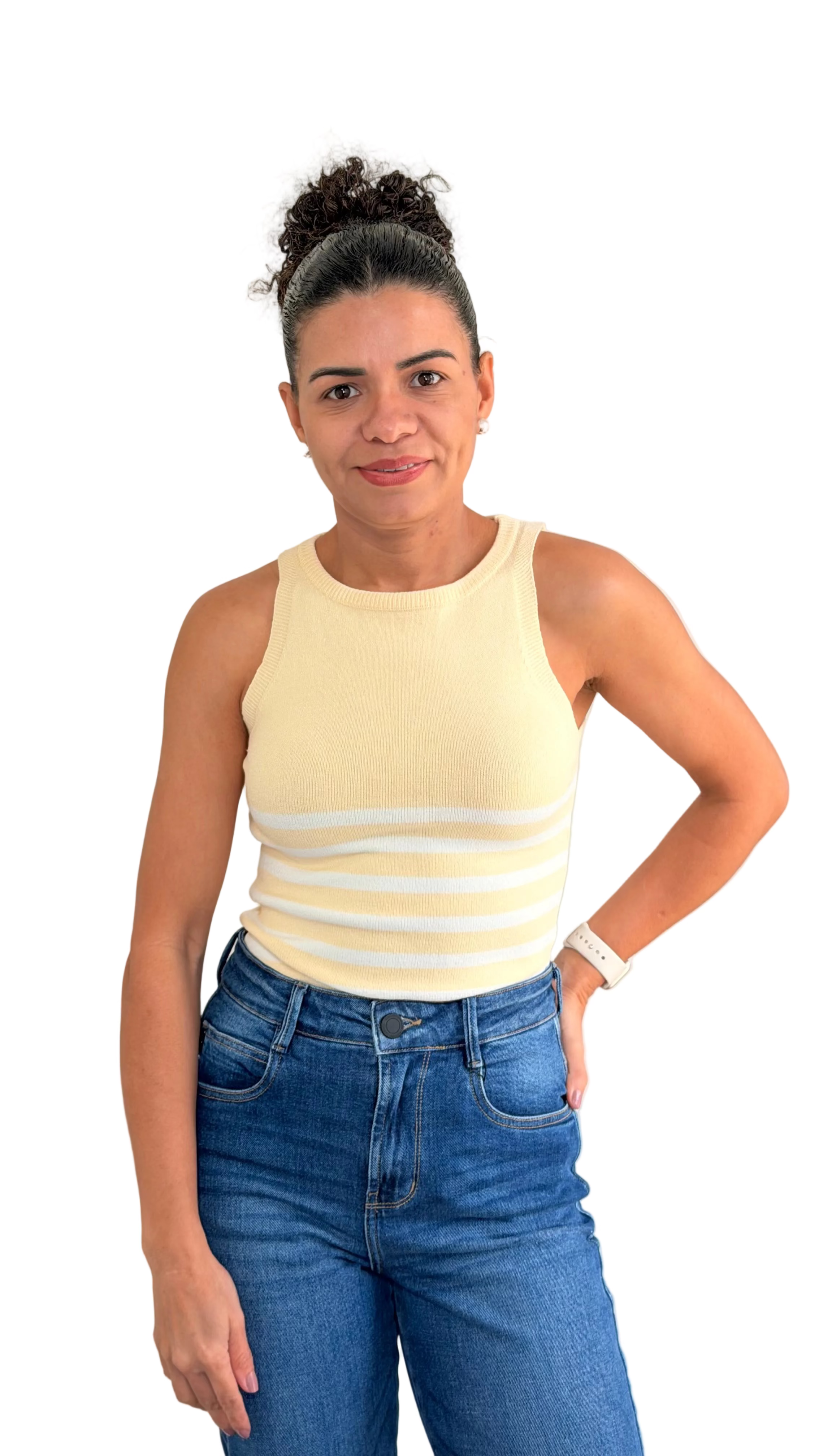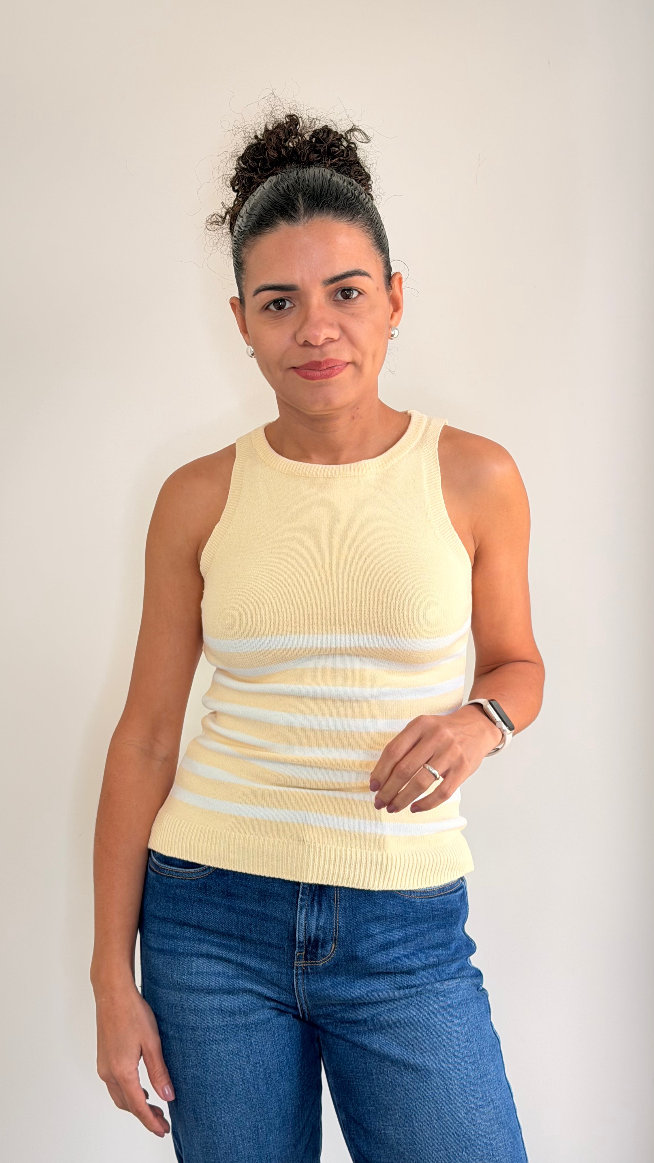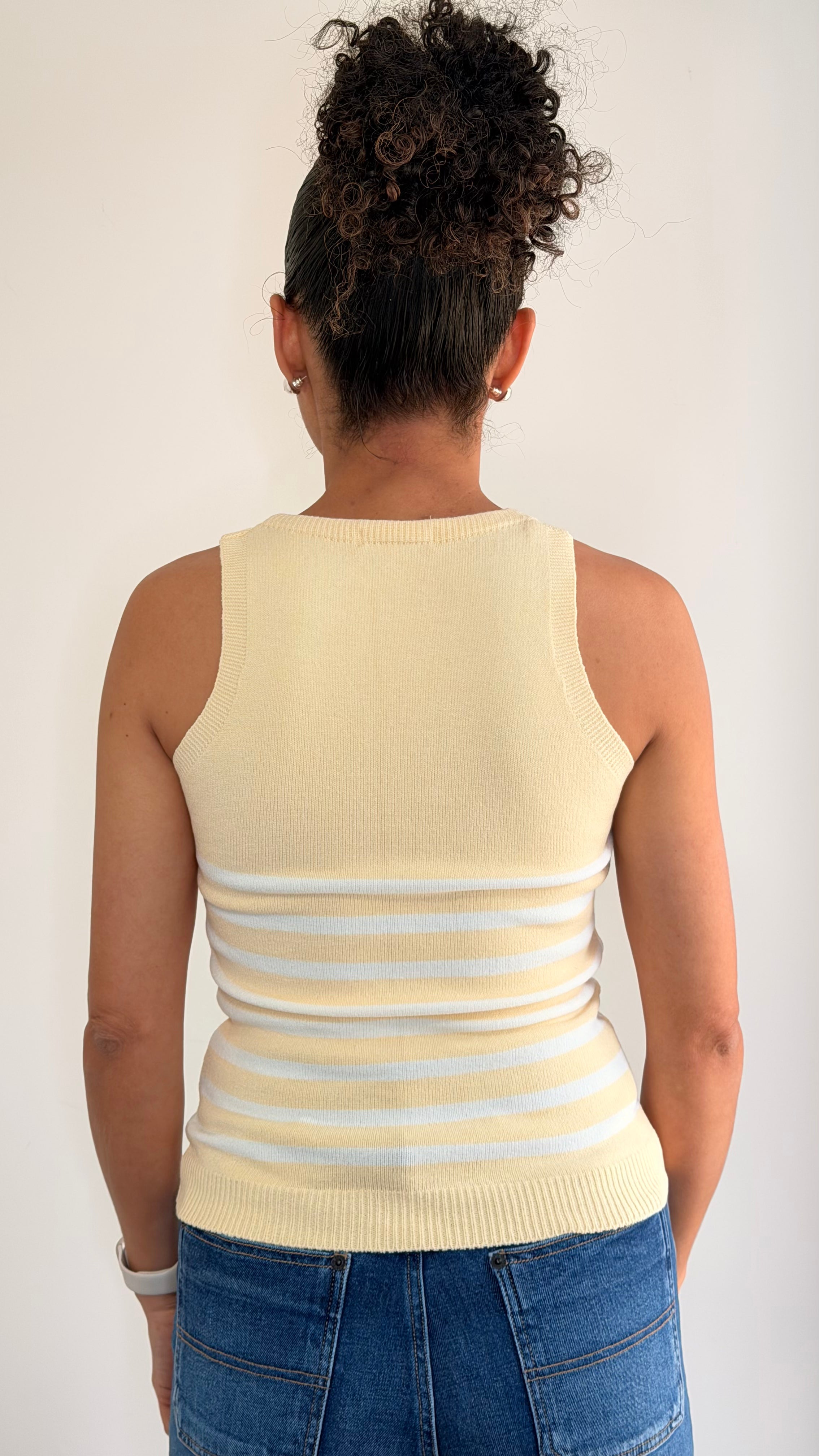 The Sunny Day Tank is a knitted tank top featuring subtle striped detailing along the bottom for a playful, polished touch. Available in sky blue and butter yellow, it’s perfect for bright, easygoing days.