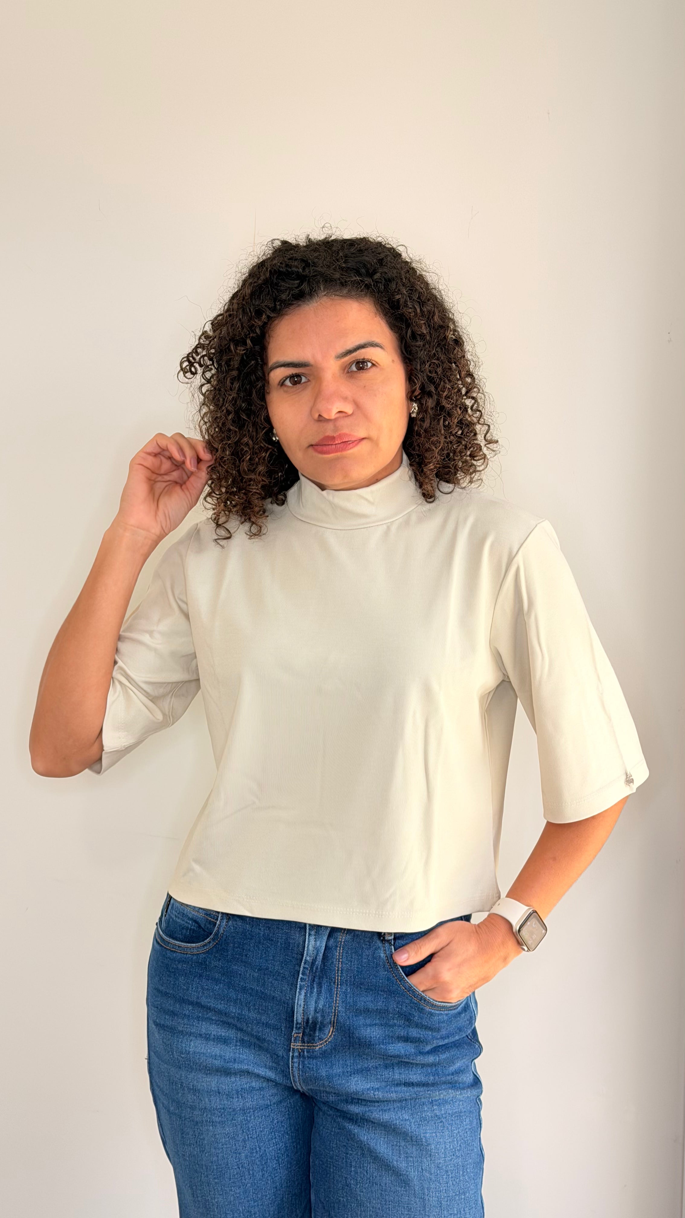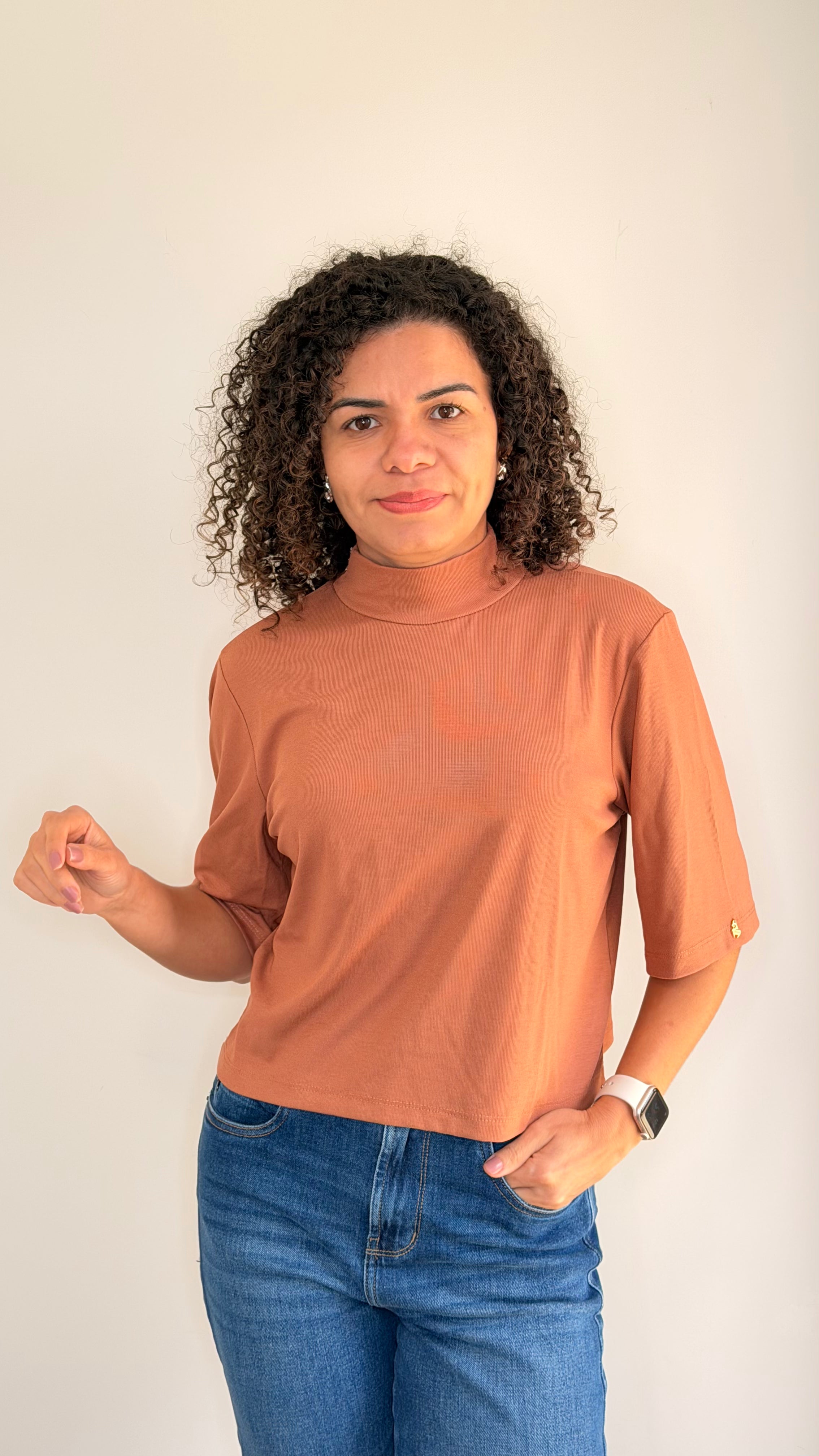The Lila Mock Tee is a stylish cropped top featuring a sleek mock neckline for a modern, polished look. Perfect for pairing with high-waisted bottoms or layering under jackets, it’s a versatile staple for effortless everyday style.