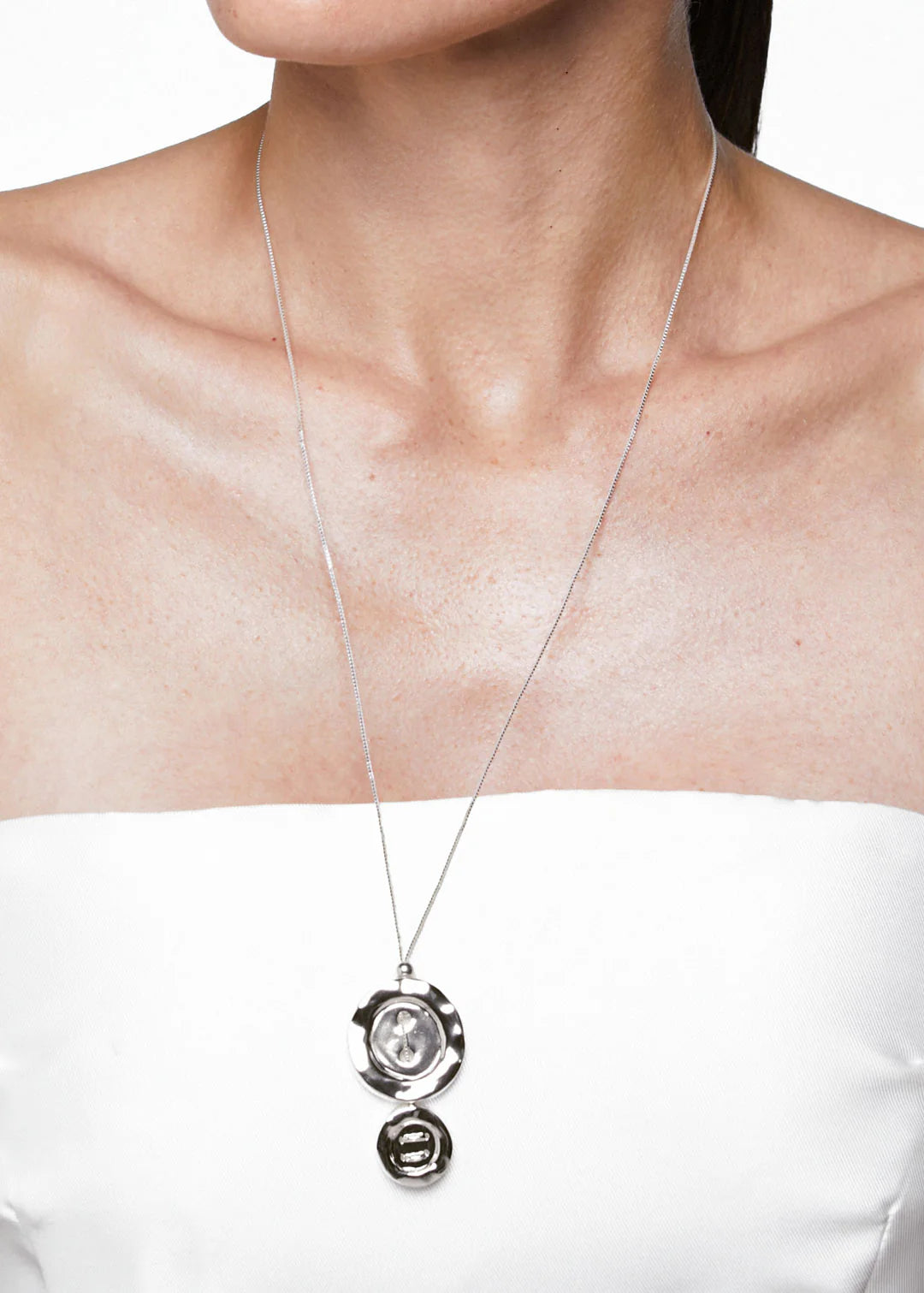 El collar Axis es una pieza llamativa, versátil y con gran presencia. Con una cadena de 80 cm y un cierre magnético en forma de T , se puede llevar largo o con doble vuelta, adaptándose sin esfuerzo al estilo de cada mujer.