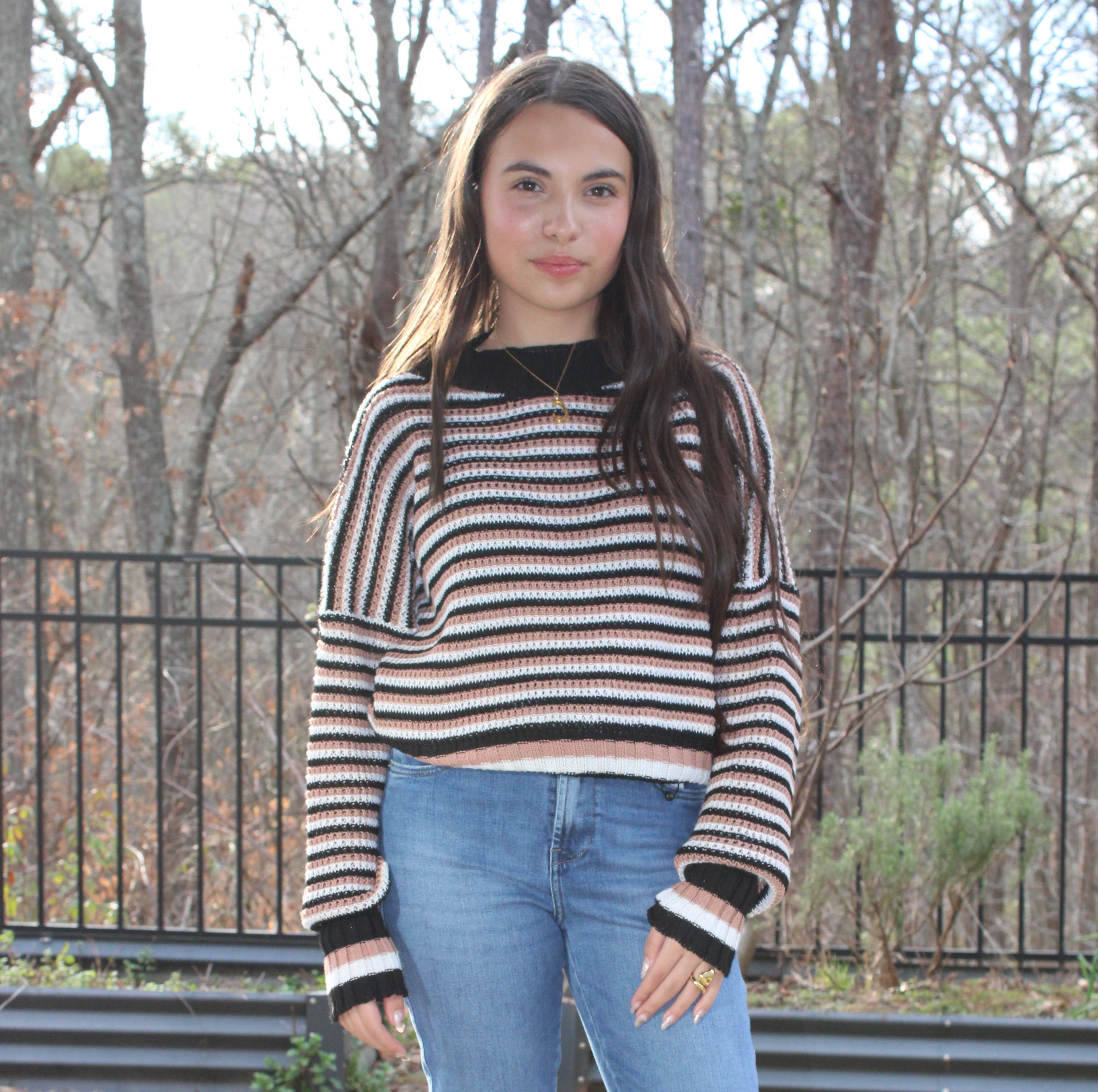 The All Things Neutral Sweater features a cozy knitted design with black, nude, and white stripes for a timeless, effortless look. Soft and versatile, it’s perfect for layering or wearing on its own.