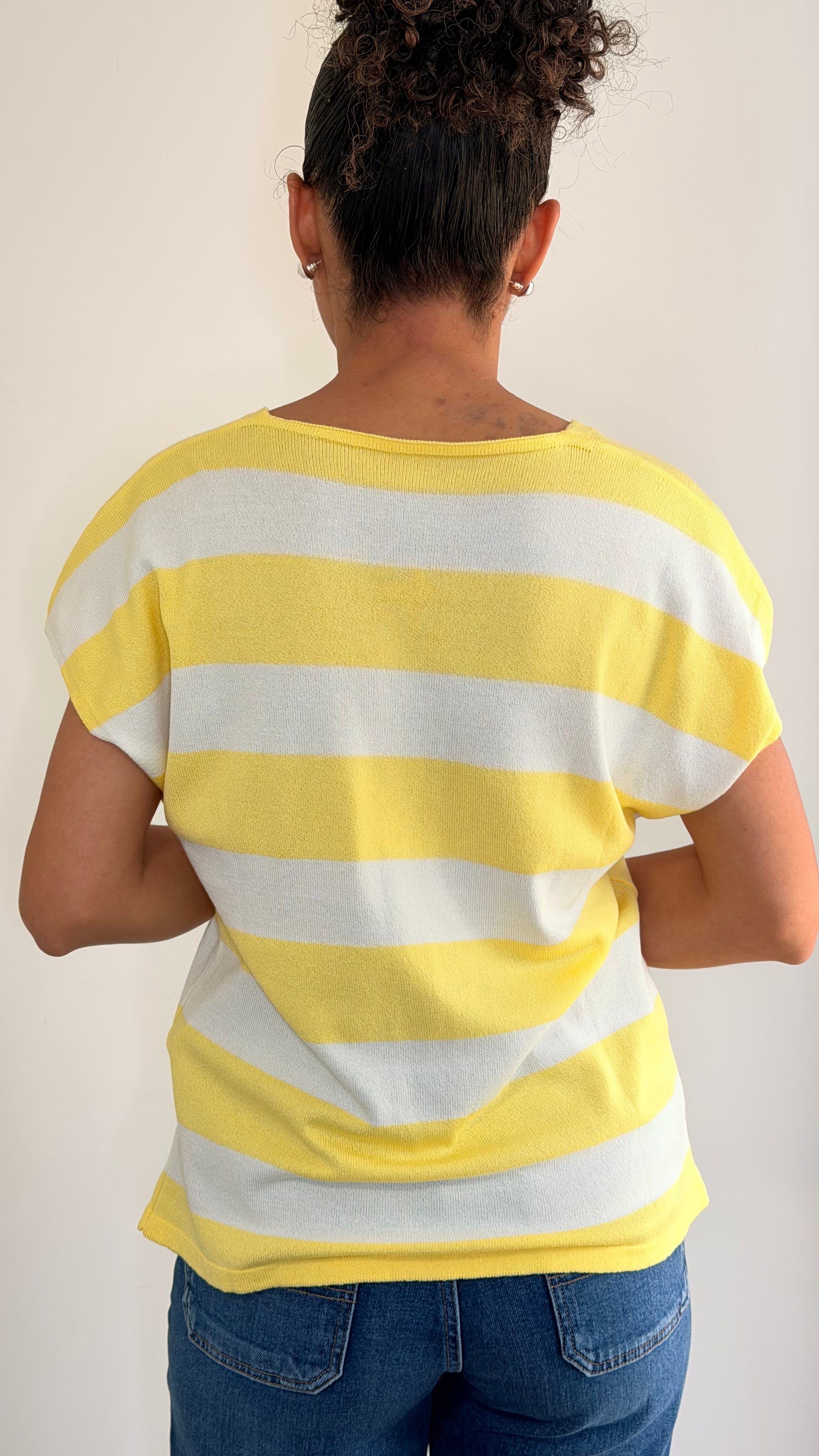 The Breezy Stripes Tee is a soft, knitted v-neck t-shirt featuring playful striped detailing for a fresh, effortless look. Available in pink & white and yellow & white stripes, it’s perfect for adding a cheerful, casual touch to any outfit.